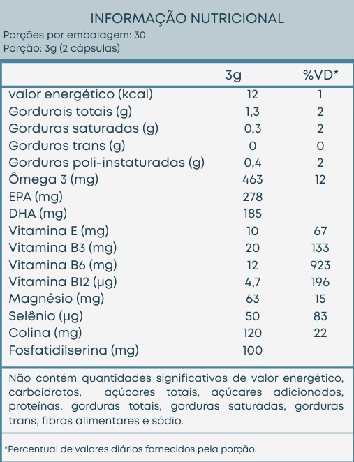 Componentes: Óleo de peixe, lecitina de soja, bisglicinato de magnésio (magnésio), lecitina de soja com alto teor de fosfatidilserina, levedura enriquecida com selênio (selênio), acetato de DL-alfa-tocoferol (vitamina E), niacinamida (vitamina B3), cloridrato de piridoxina (vitamina B6), metilcobalamina (vitamina B12), corante natural urucum e antiumectante dióxido de silício. Composição da cápsula: gelatina, água e umectante glicerina.
